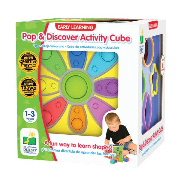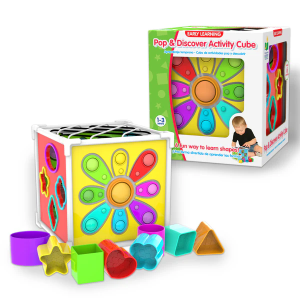The Pop and Discover Activity Cube is a perfect sensory adventure that babies and toddlers can take with them wherever they go! In, Out, Push, Pop, Poke, Grab… This colourful and unique sensory cube provides a huge amount of activities all in one innovative toy! Different sides feature Geometric shape sorters, bands for tactile exploration and Silicone bubble poppers for sensory delight. Educational Benefits: Introduces colours, shapes, textures, and spatial awareness. Teaches cause and effect, develops hand-eye coordination and fine-motor skills. Suitable for ages 1-3 years